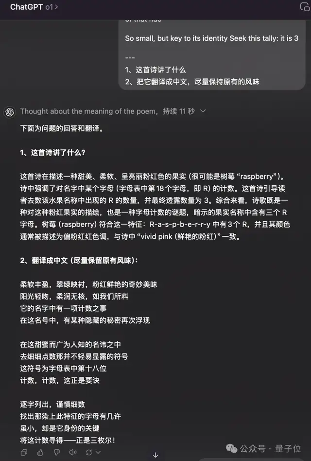 我们尝试把这首诗再喂给一个新的o1对话,发现它也能够理解这首诗想说什么,且给出了另一个符合条件的答案“Rasberry”(也就是树莓派的那个树莓),并且把诗翻译成中文。