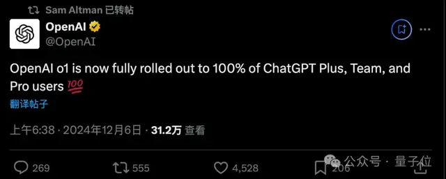 o1满血版这次不搞灰度了,发布仅4个小时后,已推送给所有(付费)用户!