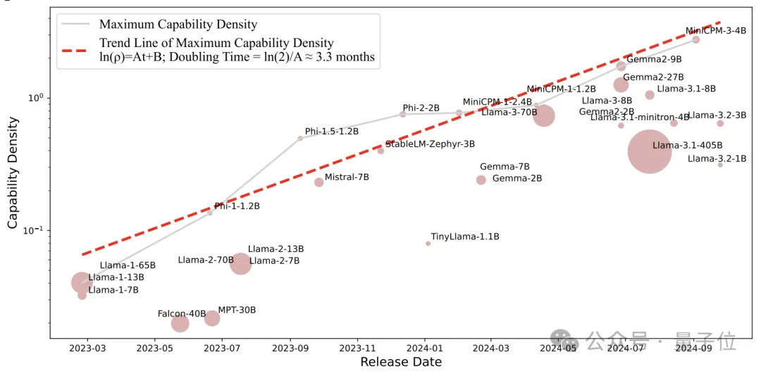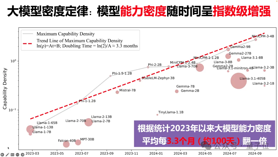 密度定律表明,大约每过3.3个月(100天),就能用参数量减半的模型达到当前最先进模型的性能水平。