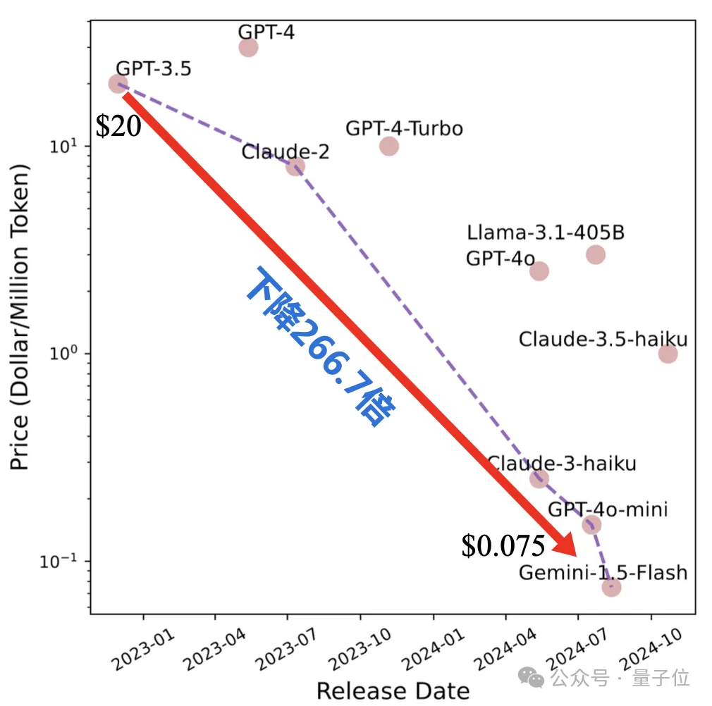 2022年12月的GPT-3.5模型每百万Token的推理成本为20美元,而2024年8月的Gemini-1.5-Flash模型仅为0.075美元,成本降低了266倍,约2.5个月下降一倍。