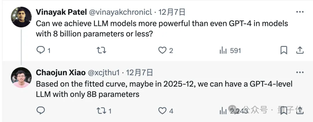 论文第一作者肖朝军表示,根据拟合曲线,到了明年年底,只要8B参数就能实现和GPT-4一样的效果。