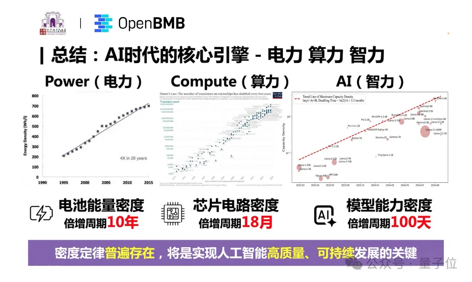 在清华刘知远老师最新报告中,AI时代的三大核心引擎——电力、算力与智力,密度都在快速增长: