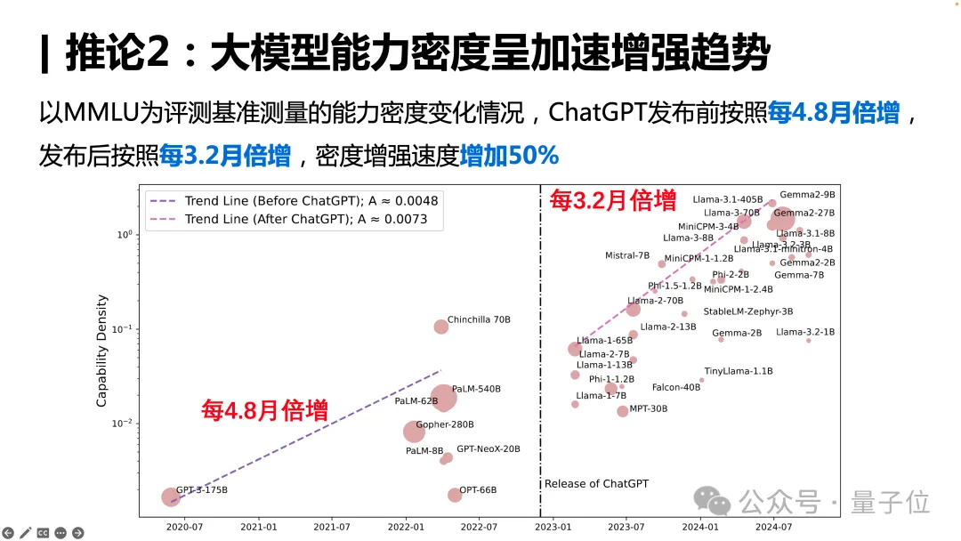 以MMLU为评测基准测量的能力密度变化情况,ChatGPT发布前按照每4.8倍增,发布后按照每3.2月倍增,密度增强速度增加50%。