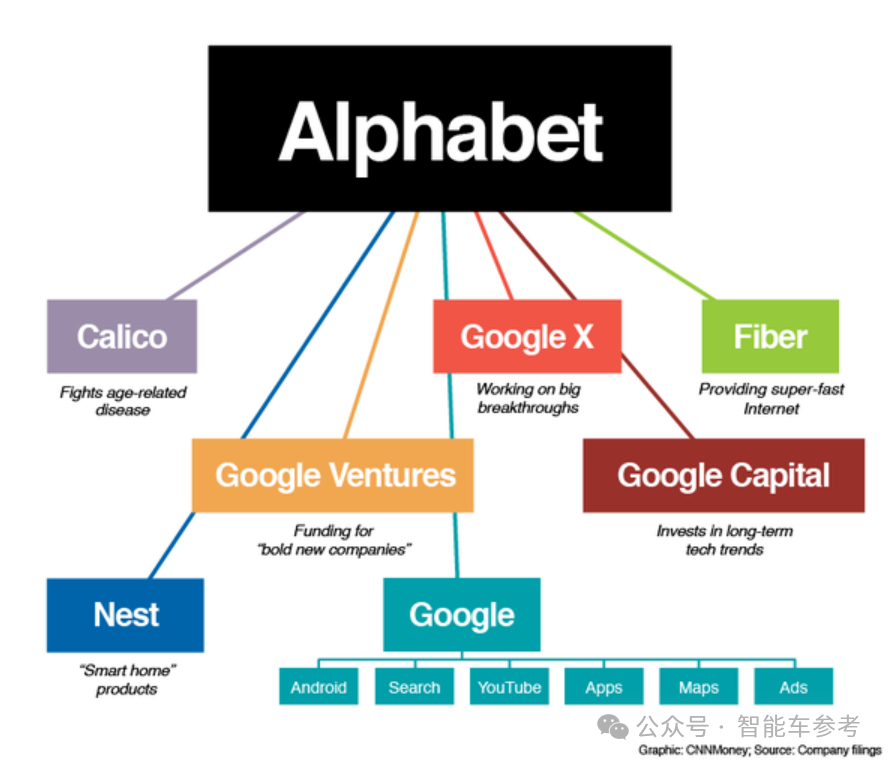 原本谷歌旗下的子公司和项目分拆为独立子公司,和谷歌一起组成了一个新集团,也就是现在的母公司Alphabet,通过财务控制的方式统一管理。