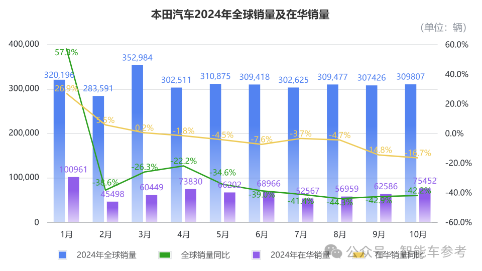 今年1-10月,本田的全球销量为310.9万辆,同比下跌3.26%,连续7个月同比下滑,9月和10月的降幅更是增加到两位数。