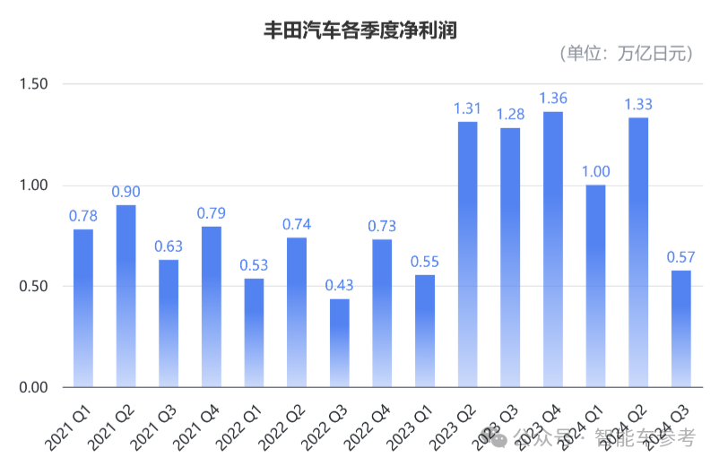 从第三季度财报看,归母净利润5737.6亿日元,同样腰斩;营业利润两年来首次出现下滑,并且大跌了20%。