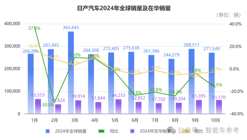 再看日产,1-10月全球交付量为277.7万辆,和去年同期基本持平,但在中国卖出的55.8万辆,同比大跌了10%。