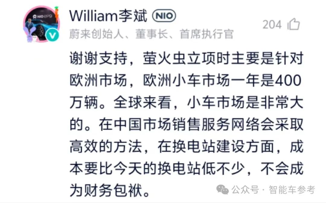 李斌表示,萤火虫的换电站会更小,成本更低,不会成为财务包袱。