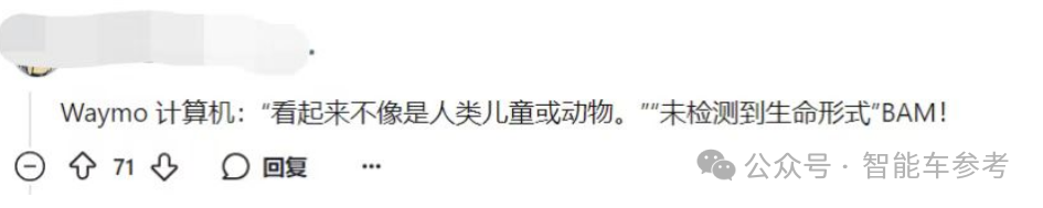 虽然这次事故没有造成人员伤亡,但也不免让人质疑起了Waymo的能力,如果遇到相同体型的对象,同样的场景,即便不是人或动物,他们的Robotaxi能否避让?