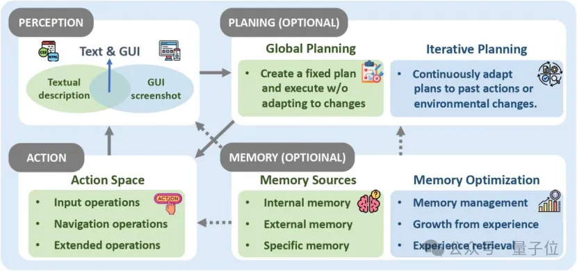 OS Agents 除了需要强大的基础模型,还需要搭配上Agent框架来增强感知、规划、记忆和行动能力。