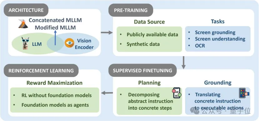 预训练(Pre-training):预训练为模型构建打下基础,通过海量数据提升对屏幕界面的理解能力。数据源包括公共数据集、合成数据集;预训练任务覆盖屏幕定位(Screen Grounding)、屏幕理解(Screen Understanding)与光学字符识别(OCR)等。