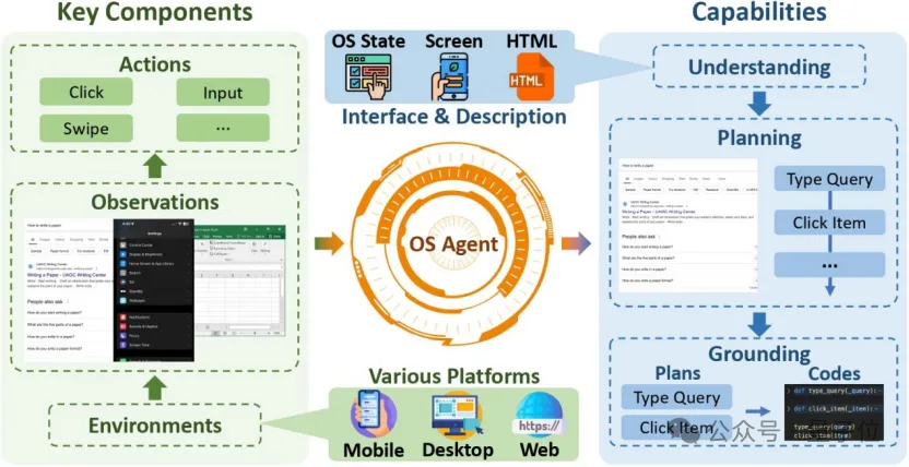 - 操作(Grounding):OS Agents最终需要将规划转化为具体的、可执行的操作,例如点击按钮、输入文本或调用 API。这种将规划“落地”的能力使得它们能够在真实环境中高效完成任务,并实现从文字描述到操作执行的精准转换。