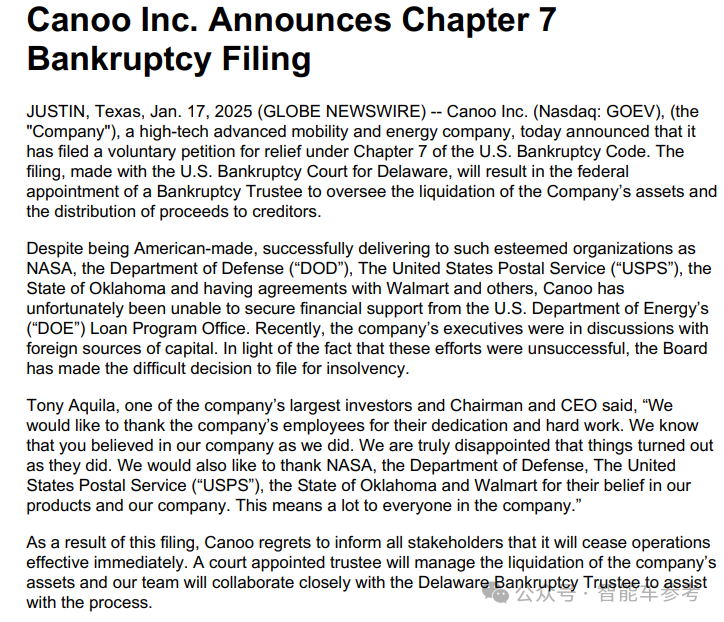 电动汽车公司Canoo刚发布了一条公告,宣告申请了美国破产法第7章,公司正式破产,并立即停止运营。