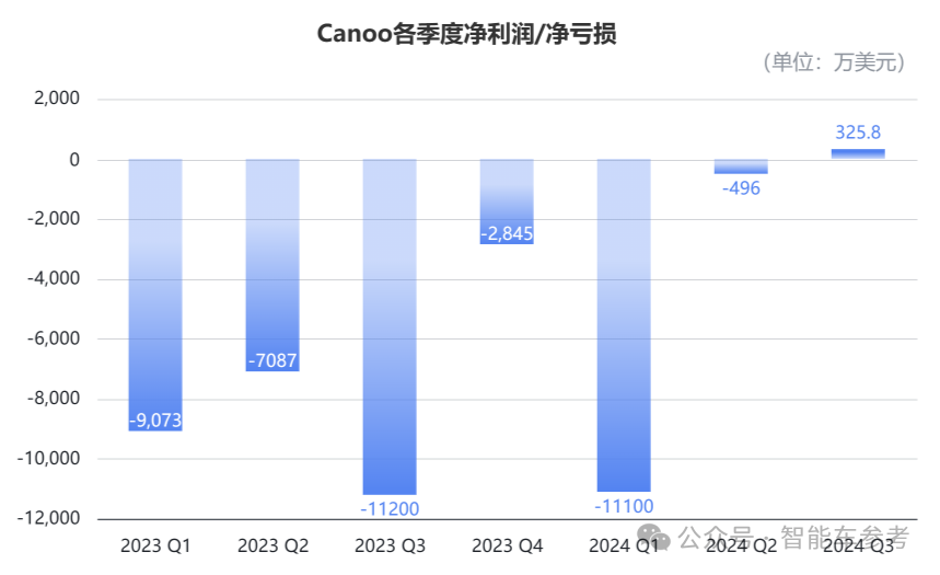 营收额不高,但增长速度惊人,主要是因为Canoo其实2023年第三季度才开始有收入,甚至去年第一季度又“颗粒无收”。