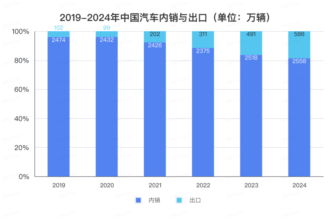 2024年,中国汽车总销量达3143.6万辆,其中内销为2558万辆车,只比去年多卖了40万辆车,仅增长1.5%,低于整体增长。