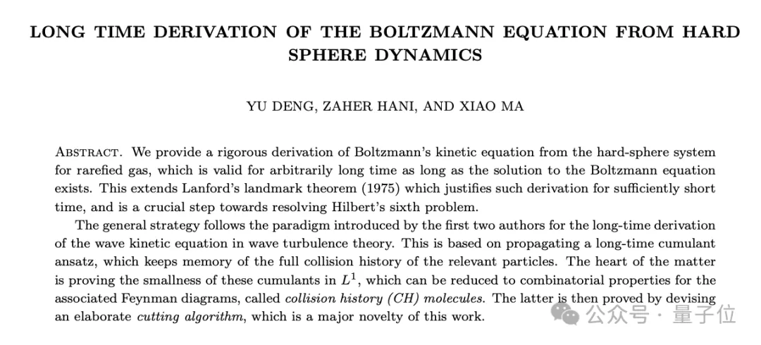 直到去年,邓煜等三人联手,用一篇164页的论文,从稀薄气体硬球系统严格推导了玻尔兹曼动力学方程,使得希尔伯特第六问题的解决之路又向前迈进了一大步。