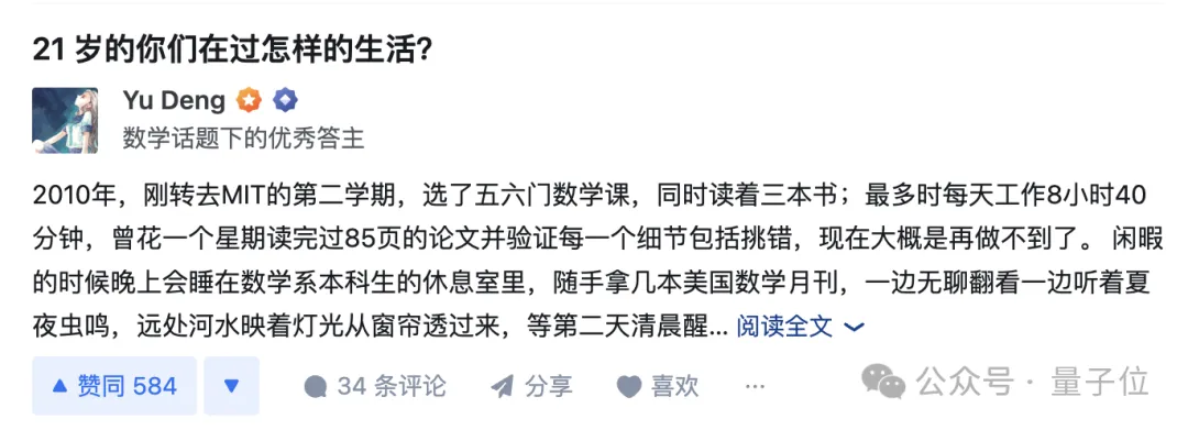 据邓煜本人在知乎介绍,他转到MIT的第二个学期,选了五六门数学课,同时读着三本书,最多时每天工作8小时40分钟,曾花一个星期读完过85页的论文并验证每一个细节包括挑错……