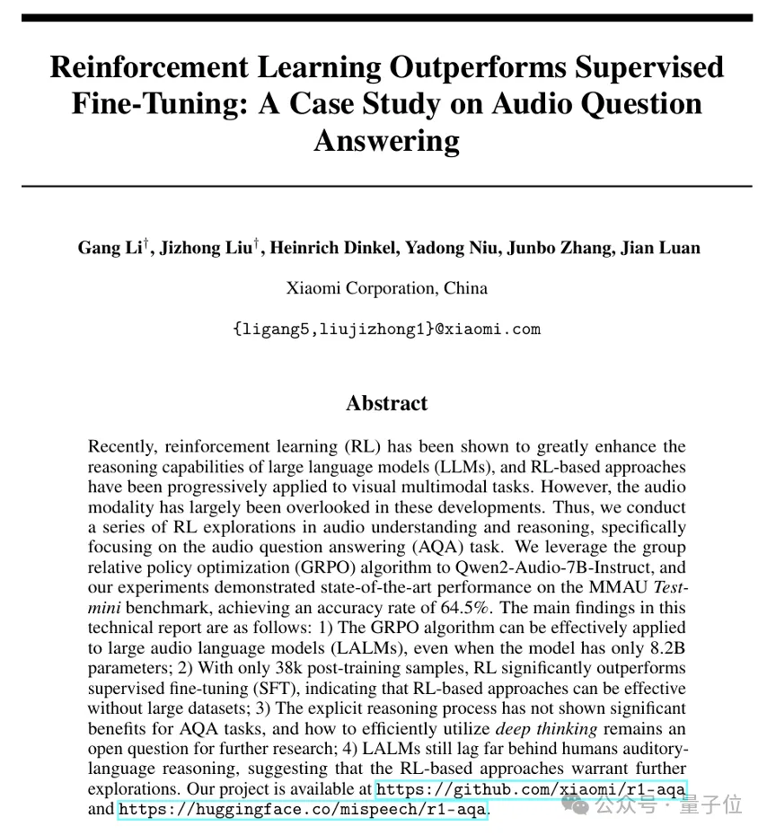 迁移DeepSeek-R1同款算法,小米让7B模型登顶音频理解推断MMAU榜单