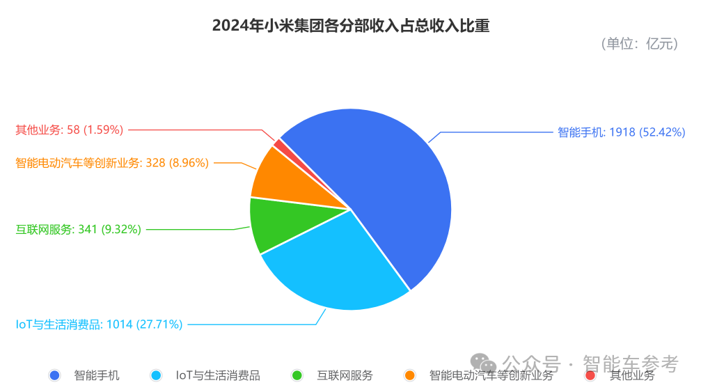 2024年全年,小米智能电动汽车等创新业务收入为328亿元,其中纯粹的智能汽车营收为321亿元,占总收入的8.8%,相当于靠卖车日赚8770万元。