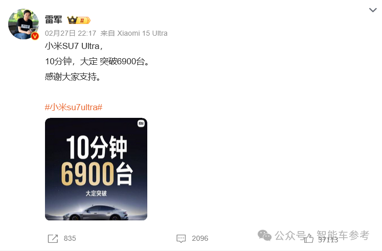 52.99万的小米SU7 Ultra,2月底正式发布,10分钟大定破6900台,3天大定超1.9万台,锁单超1万辆,提前完成全年1万台的销量目标。