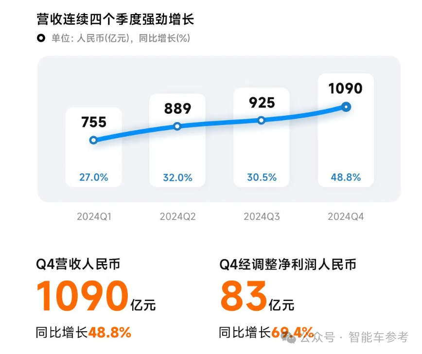 先来看2024年的整体表现,小米集团全年营收3659亿元,同比增长35.0%;第四季度营收首次破千亿,达到1090亿元,同比增长48.8%。