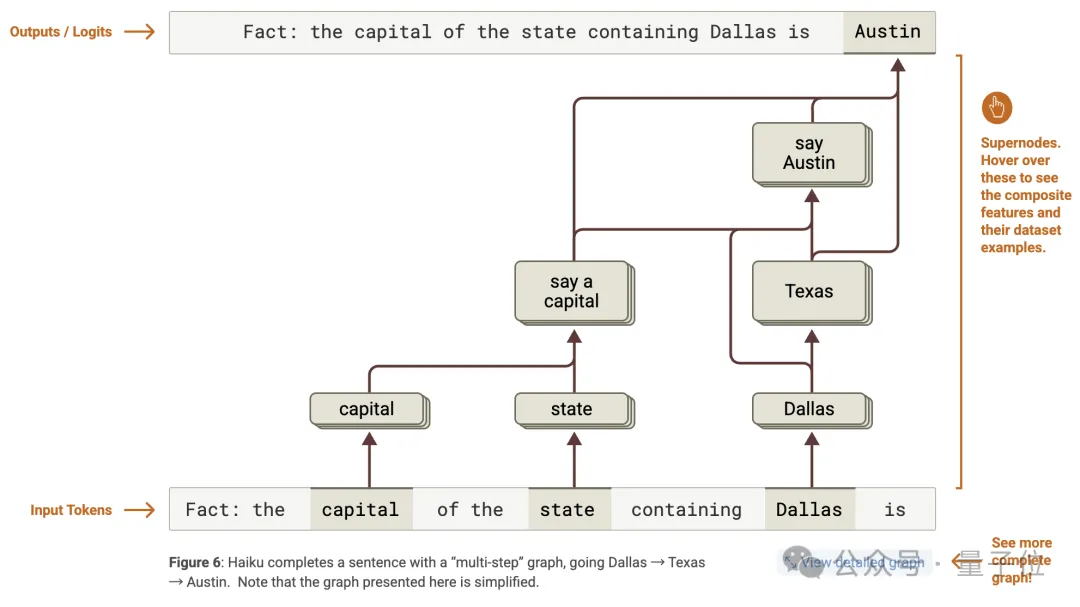 这些特征相互作用,形成从 “Dallas” 到 “Texas” 再到 “Austin” 的推理路径,同时也存在从 “Dallas” 直接到 “say Austin” 的 “shortcut” 边。