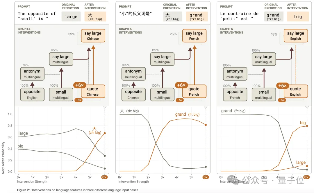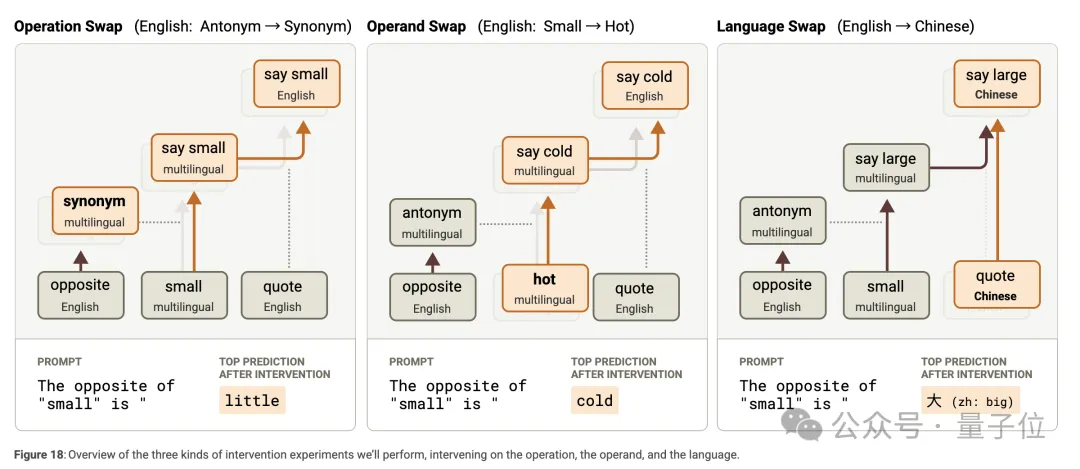 干预实验表明,交换操作(反义词换为同义词)、被操作单词(“small” 换为 “hot”)和语言特征,模型能相应地输出合适的结果,证明了电路中各部分的独立性和语言无关性。