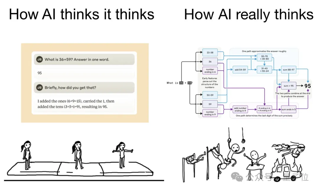 这可能反映了这样一个事实——模型在解释数学问题时会模仿人类的方式,但在自己做计算的时候“头脑中”使用的却是自己的一套方法。