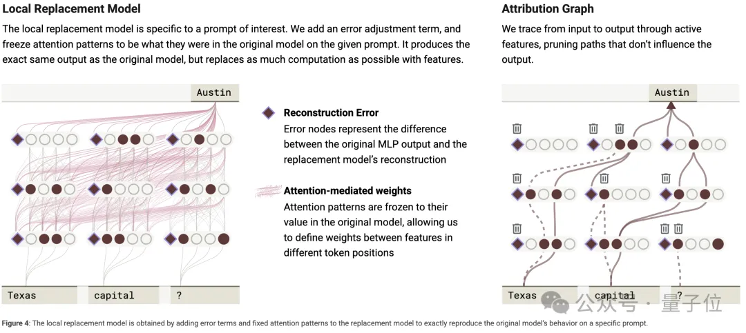 这个模型不仅用CLT替换MLP层,还固定原模型在该提示下的注意力模式和归一化分母,并对CLT输出进行误差调整,使得局部替代模型的激活和输出与原模型完全一致。