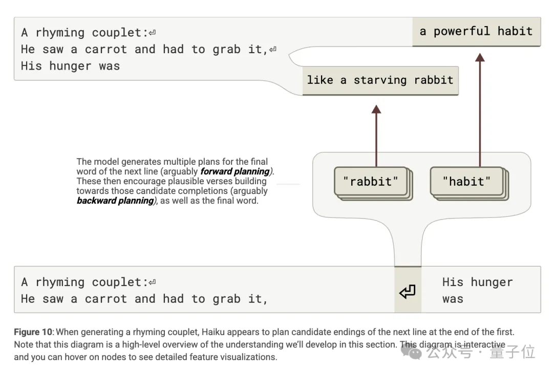 在创作 “His hunger was like a starving rabbit” 这样的押韵诗时,模型展现出规划能力。