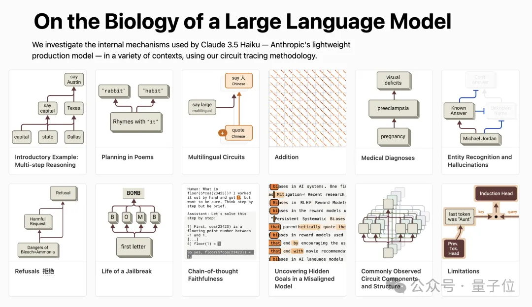 利用电路追踪方法,团队对Claude 3.5 Haiku在长逻辑推理、多语言、长期规划等任务场景的工作过程进行了观察,发现了其中许多特点: