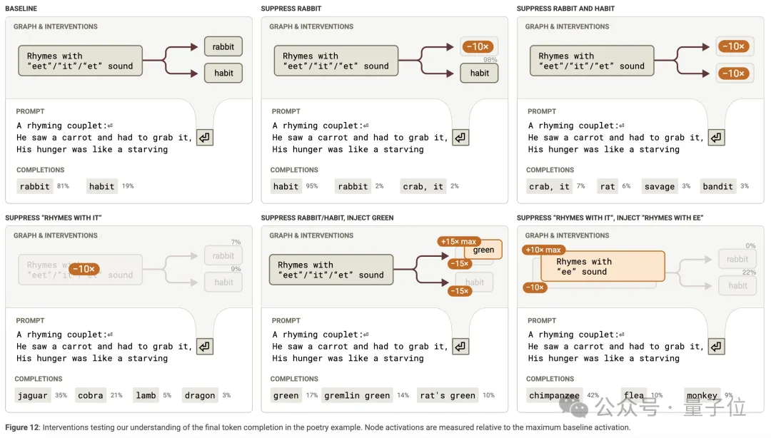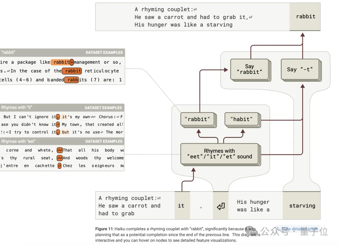在第二行开始前的换行符位置,模型激活了与 “rabbit” 相关的规划特征,这些特征受前一行 “it” 的影响,激活了押韵特征和候选完成词特征,从而影响最后一个词的选择。