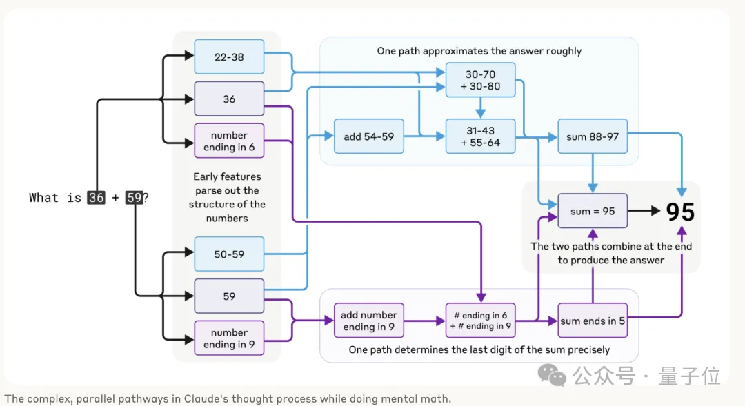 在“数学计算”当中,作者发现Claude采用了多条并行工作的计算路径。