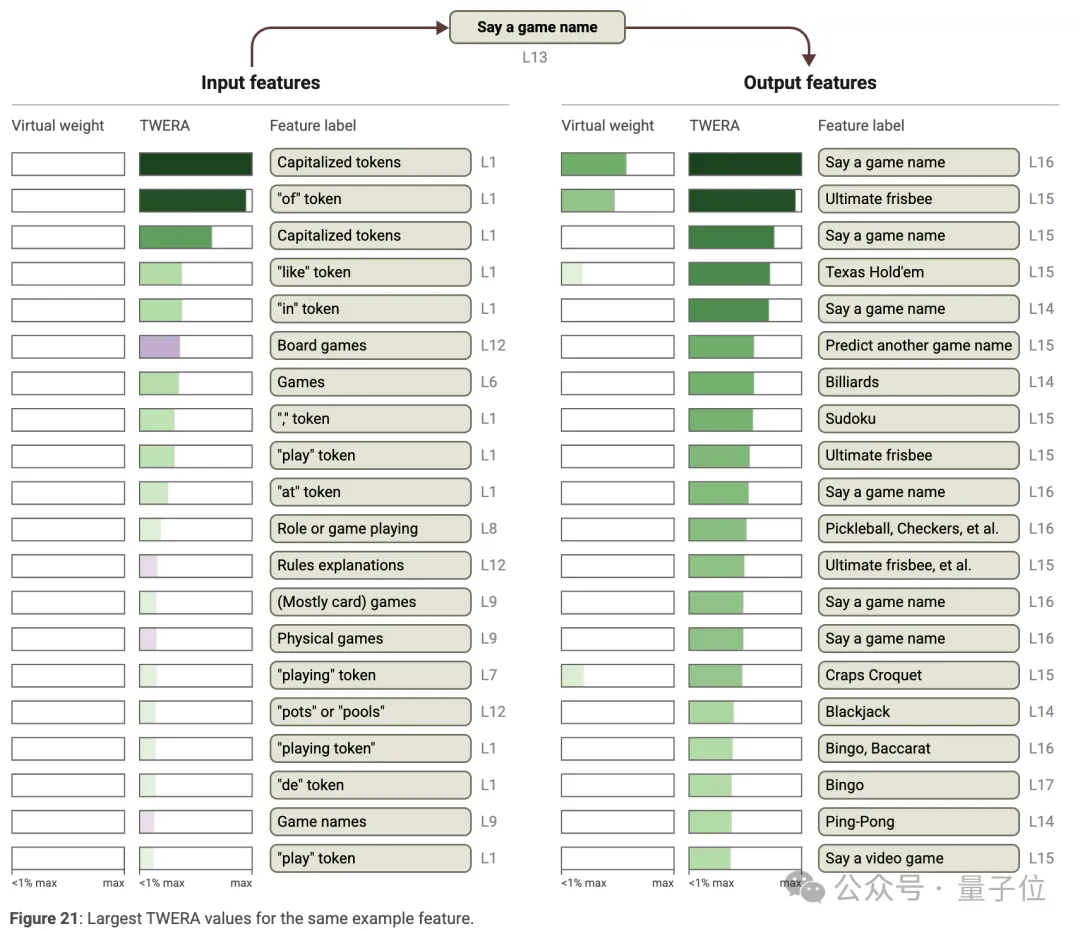 除了研究特定提示下的特征交互(归因图分析),研究人员还关注特征在不同上下文下的交互,这就涉及到全局权重。