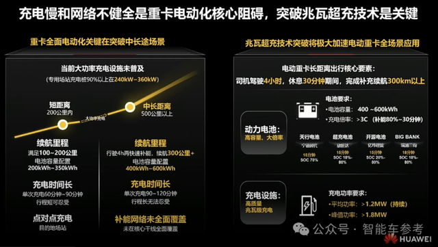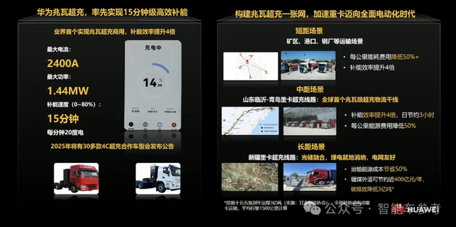 针对该问题,华为发布了商用的兆瓦超充技术,最大电流可达2400A,最大功率1.44MW,3秒钟可补1度电,覆盖短、中、长途等不同场景。