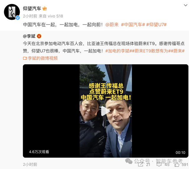 他还在现场还带王传福体验蔚来ET9,双方互相点赞了各自最近上市的行政旗舰轿车。