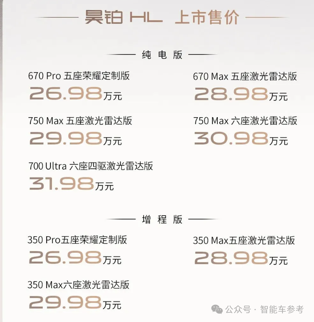 昊铂HL共有8个车型,纯电和增程双动力,分为Pro和Max和Ultra三个系列,Pro版没有车载冰箱,城区NOA需要额外选装,Ultra装有交互灯语大灯。