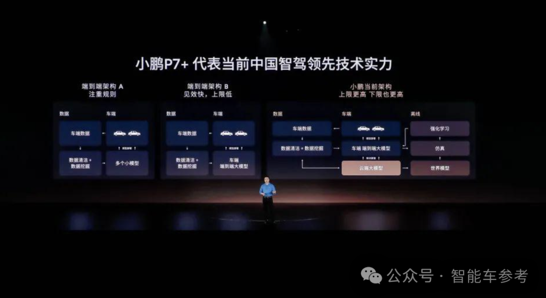 算法端,小鹏目前的端到端超越简单的“一段式”或“多段式”,采用了车端+云端大模型的方式: