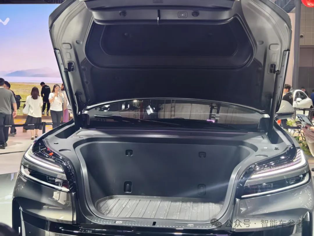 乐道最新车型L90也迎来首秀,秀了一波超大前备箱,近看起来确实夸张: