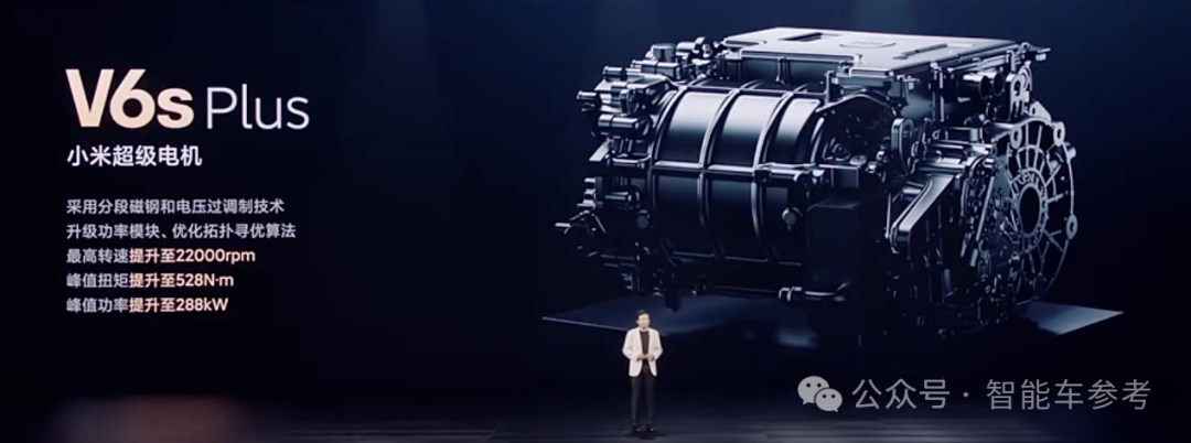 YU7全系搭载了800V,15分钟补能620km。搭载的电机是小米超级电机V6s Plus,转速提升到了22000rpm。