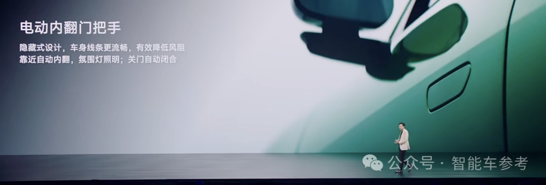 门把手则改成了电动内翻门把手,不再是半隐藏式,人一走近会自动弹开,上车后会关上: