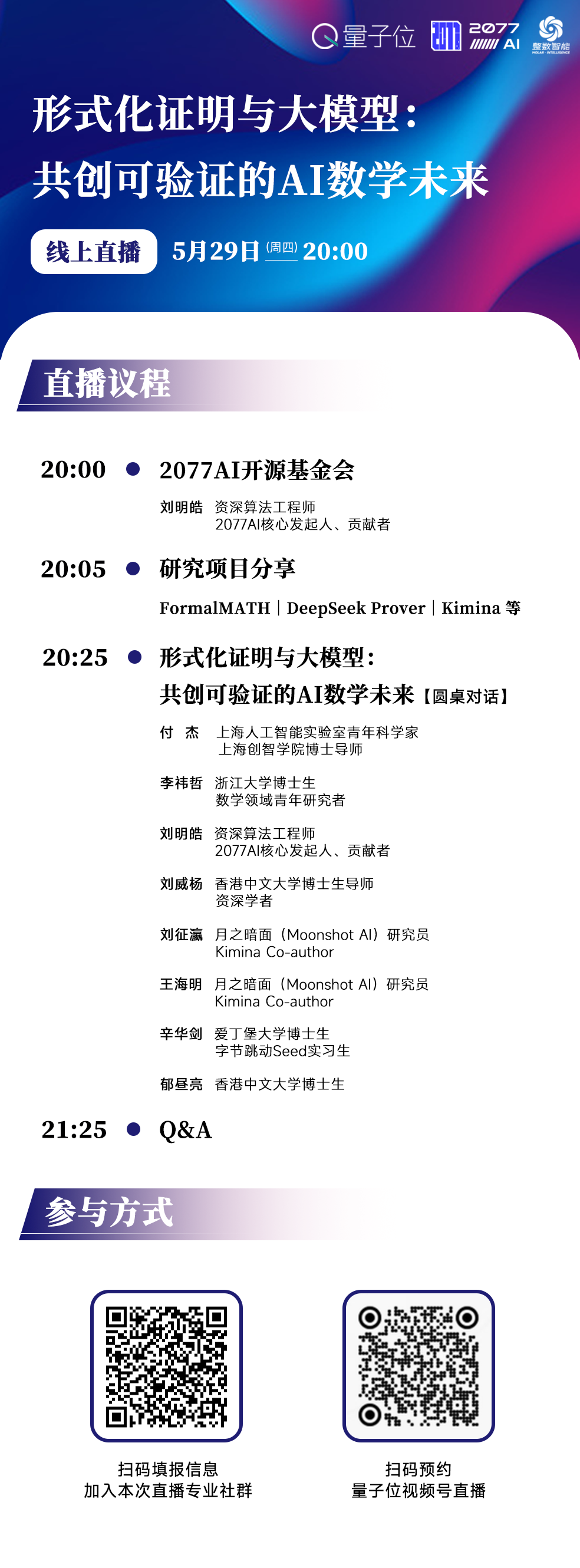 为了回答这些问题,5月29日20:00,我们与2077AI开源基金会共同邀请到了来自FormalMath、Kimina等项目团队的成员,一同来讨论大语言模型形式化证明前沿探索。