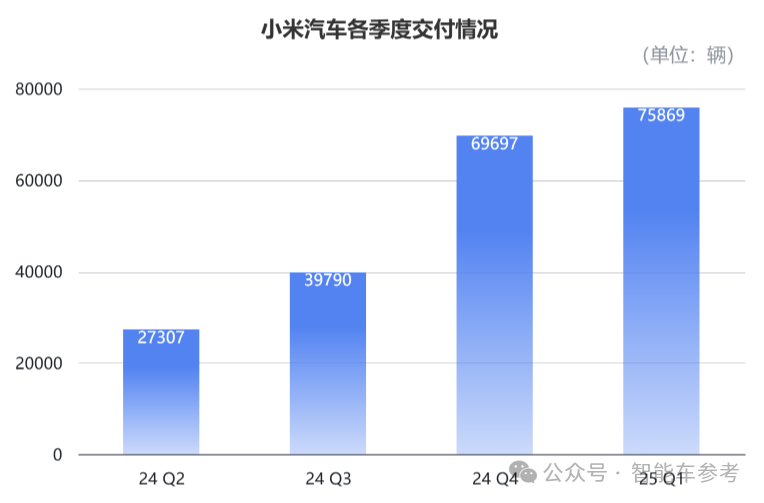 今年一季度,小米汽车销量为75869辆,平均下来每天能卖出843台车;上市14个月,小米SU7累计已交付超258000辆车。