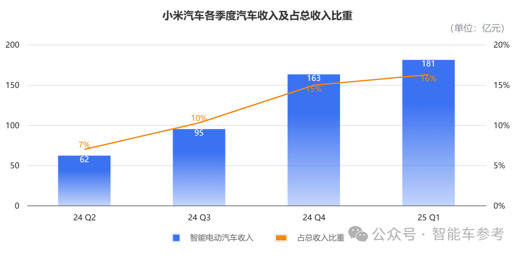 其中,汽车销售收入为181亿元,占小米集团总收入的16.3%,平均每天卖车入账20亿;汽车周边产品收入则为5亿元。