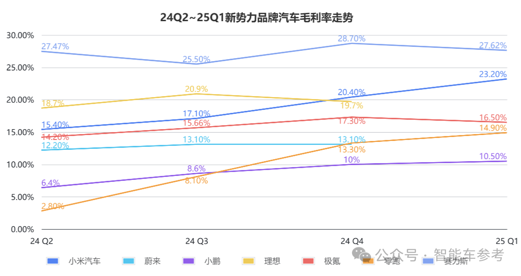 去年第二季度首次披露时是15.4%,到去年四季度就已经达到20.4%,迈过了汽车行业普遍认可的利润线,在当时就已经超越多数新势力品牌,仅次于赛力斯的28.7%,到今年一季度,小米汽车毛利率已达到23.2%。