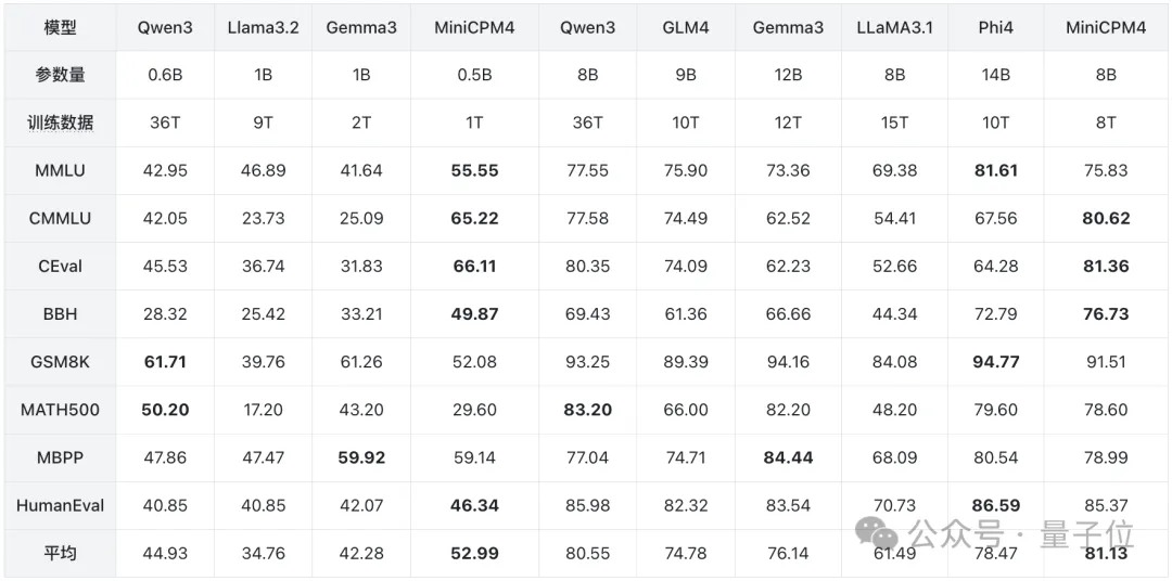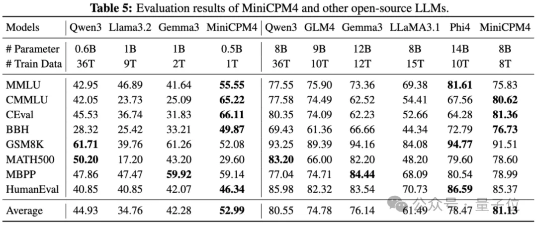 MiniCPM 4与其它开源大语言模型的评测结果: