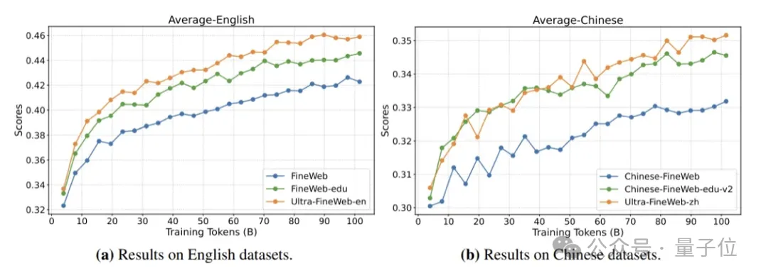 最终,利用该数据筛选策略,基于FineWeb数据,筛选得到大规模高质量数据UltraFineWeb,包含有1T+高质量的中英文预训练语料。其中预训练结果对比如下图所示。