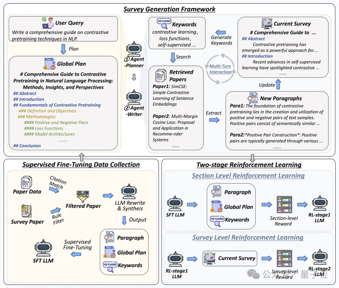 团队构建了包含规划大纲、检索关键词、节级内容等高质量训练数据,并设计了从监督微调(SFT)到章节级、全局级强化学习(RL)的多阶段训练策略,逐步提升模型的全局规划性和细节深度。