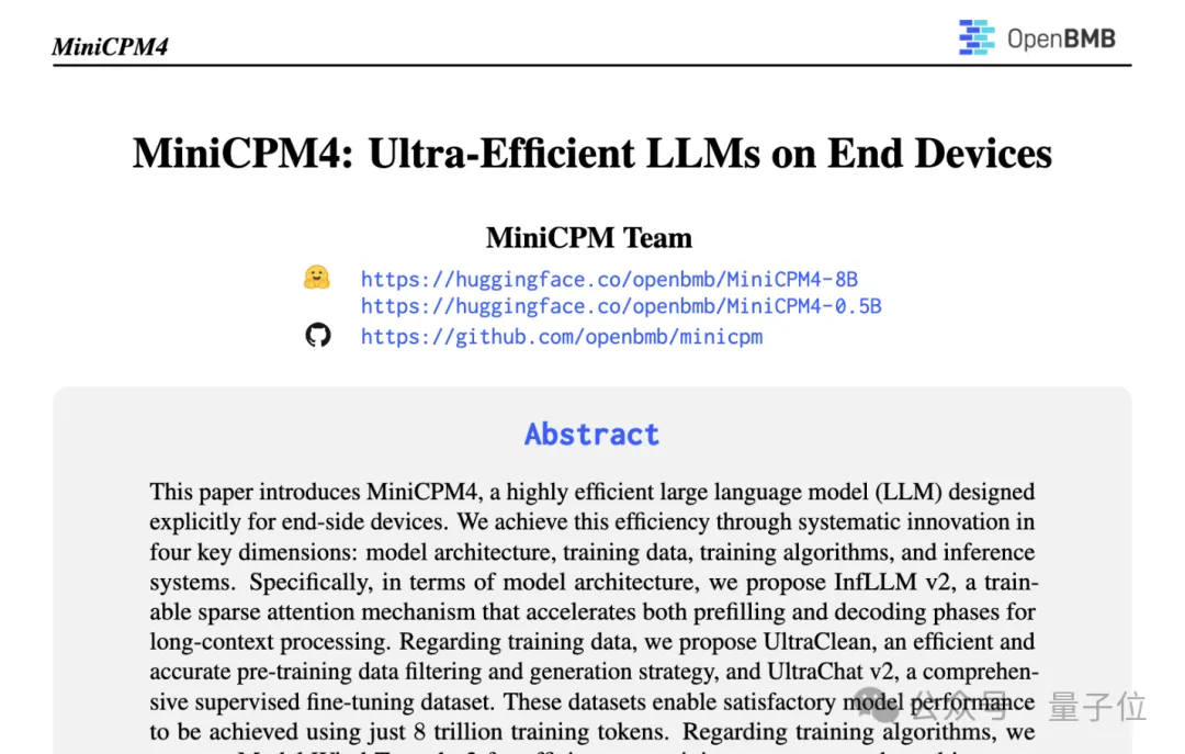 MiniCPM4-8B是开源首个开源的原生稀疏模型,5%的极高稀疏度加持,让长文本、深思考在端侧真正跑起来。