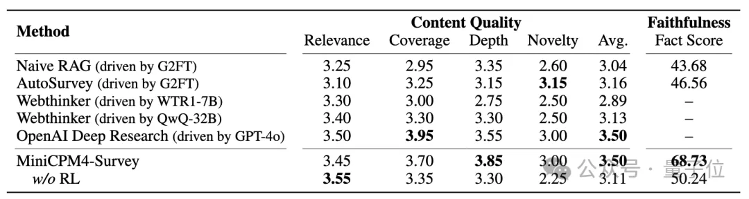 下方表格展示了 MiniCPM4-Survey与基线模型的评测结果。“G2FT”代表Gemini-2.0-Flash-Thinking,“WTR1-7B”表示Webthinker-R1-7B。